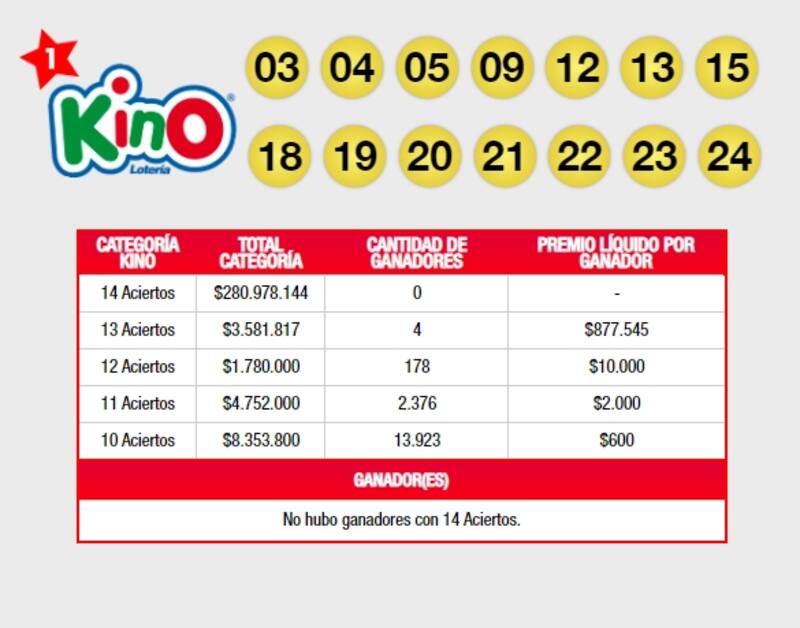 Además hubo 4 personas que con 13 aciertos en Kino se llevaron $877.545 cada uno; 178 se quedaron con $10.000 en la categoría de 12 aciertos. En las de 11 aciertos un total de 2.376 se embolsaron $2.000 y 13.932 personas con 10 aciertos recibirán $600.