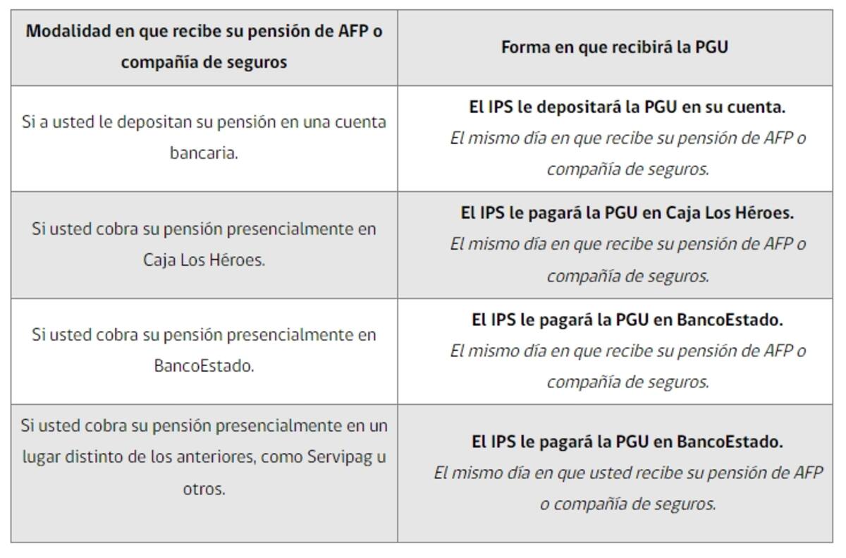 Por otra parte, si cobras la PGU presencialmente en Caja Los Héroes o Banco Estado, se mantendrá el pago en estas mismas instituciones, recibiendo el dinero el mismo día que la pensión de AFP o de la compañía de seguros. Pero si recibes la Pensión Garantizada Universal presencialmente en alguna entidad diferente a las mencionadas, como Servipag, Banco Santander, Banco Falabella u otros, el IPS pagará la PGU en Banco Estado el mismo día en que recibes la pensión normal de AFP o compañía de seguros.