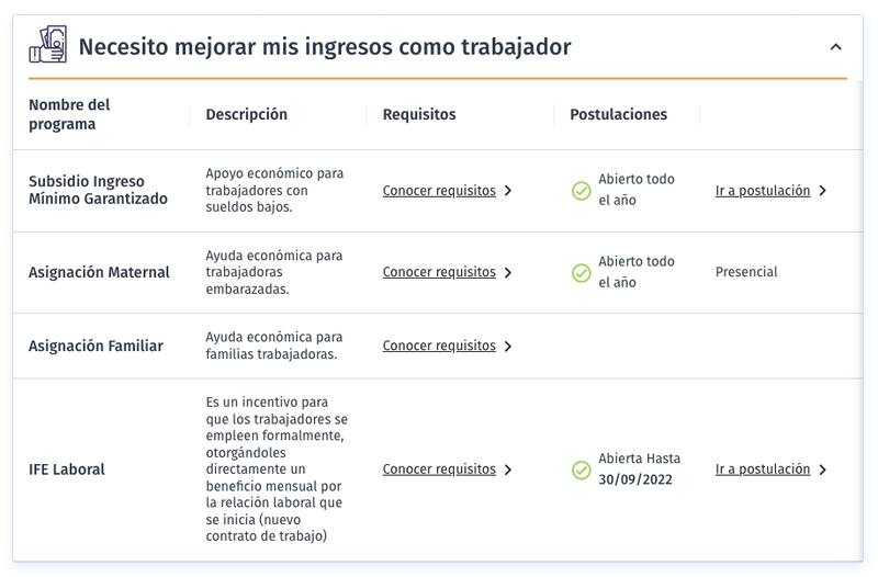 Una vez que ingreses a la plataforma, lo primero que verás serán los cuadros de los distintos beneficios que puedes consultar, los que pueden ser en materia de Ingresos, Vivienda, Salud, Educación, entre otros.