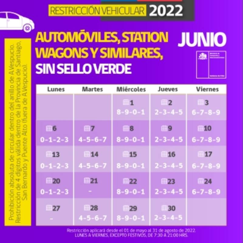 Tal como se estableció por el Ministerio del Medio Ambiente y el Ministerio de Transportes y Telecomunicaciones, desde el 1 de mayo al 31 de agosto regirá en la Región Metropolitana la restricción vehicular. Medida que busca disminuir el índice de polución, y mejorar las condiciones del aire en esta zona.
