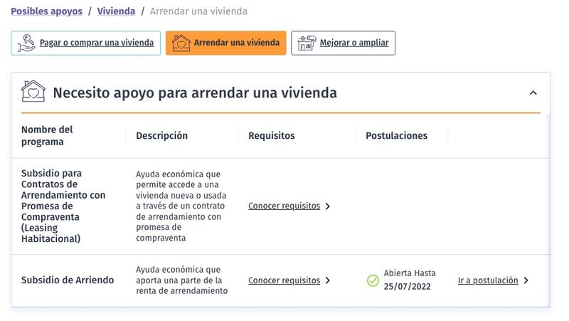 Finalmente, cuando selecciones el tipo de beneficio que te interesa recibir, se abrirá un listado con los aportes a los que puedes postular según tu perfil. Esta información puede variar dependiendo del perfil del consultante en la plataforma.