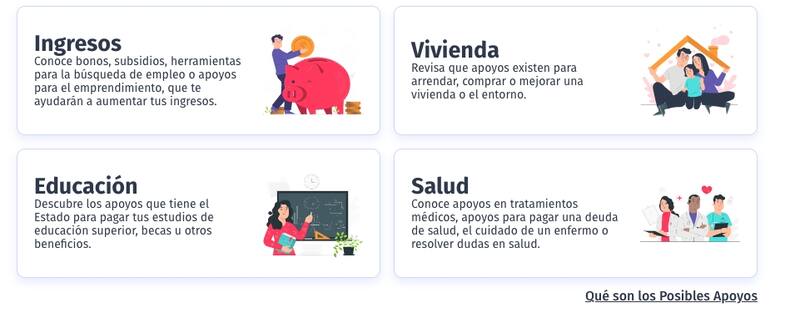 Para acceder a la plataforma de la Red de Protección, como se mencionó anteriormente, deberás ingresar tu Clave Única o RUT y número de serie. Inmediatamente se abrirá el apartado de "Posibles apoyos" cuando accedas. Que lucirá de esta forma o similar: