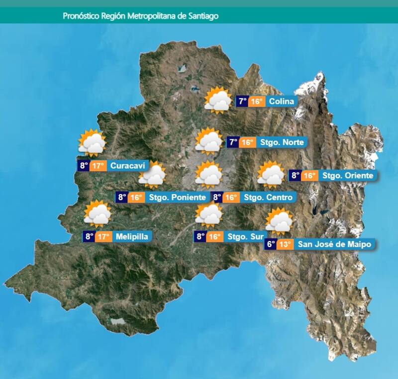 Con respecto a las temperaturas, estas tendrán una variación entre los 16°C la máxima -cerca de las 14:00 horas- y 7°C de mínima.