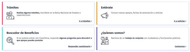 Primero, debes ingresar al sitio web de la Red de Protección Social. Una vez dentro, aparecerán cuatro cuadros: "Trámites", "Entérate", "Buscador de Beneficios" y "¿Quiénes Somos?".