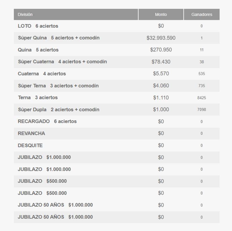 Sin embargo, un(a) afortunado(a) se quedó con $32.993.590 en la Súper Quina. Además, en la modalidad Quina 5 aciertos, 11 jugadores(as) ganaron $270.950; y en la Súper Cuaterna otras 38 personas recibieron un monto de $78.430.