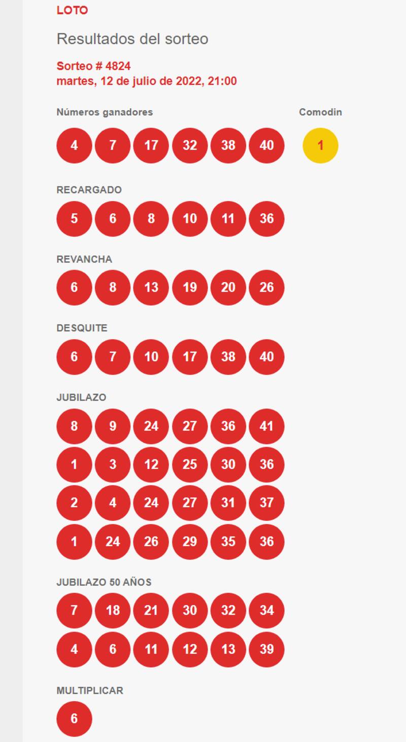 Ningún ganador(a) se registró en las siguientes categorías: Loto 6 aciertos; Recargado, Revancha, Desquite y Jubilazo $1.000.000, $500.000 y 50 años.