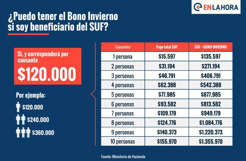El nuevo Bono Invierno entregará un monto de $120.000 por causante, siendo este un único pago. En este sentido, si por ejemplo el beneficiario tiene tres cargas familiares, recibirá $360.000. Esto, en caso de solo recibir este subsidio.