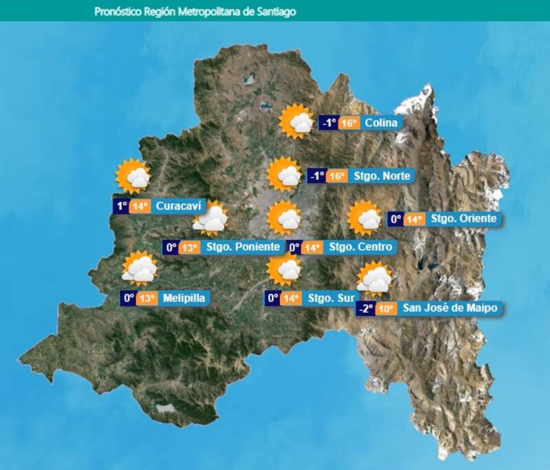 Según informa la Dirección Meteorológica de Chile (DMC), no caerá precipitaciones esta nueva jornada. Sin embargo, habrán bajas temperaturas. La mínima será de 0°C en gran parte de la RM, mientras que la máxima solo alcanzará los 10 grados.