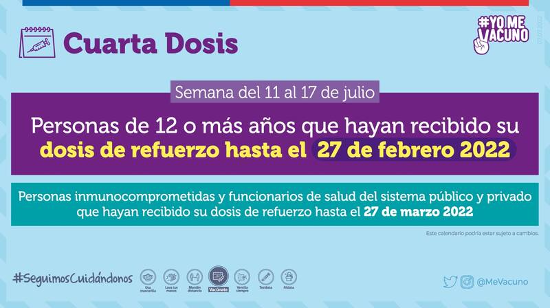 Según lo dispuesto por el Ministerio de Salud, esta jornada nuevos grupos podrán recibir la cuarta dosis (denominada segunda dosis de refuerzo), la que es necesaria para tener activo el Pase de Movilidad.