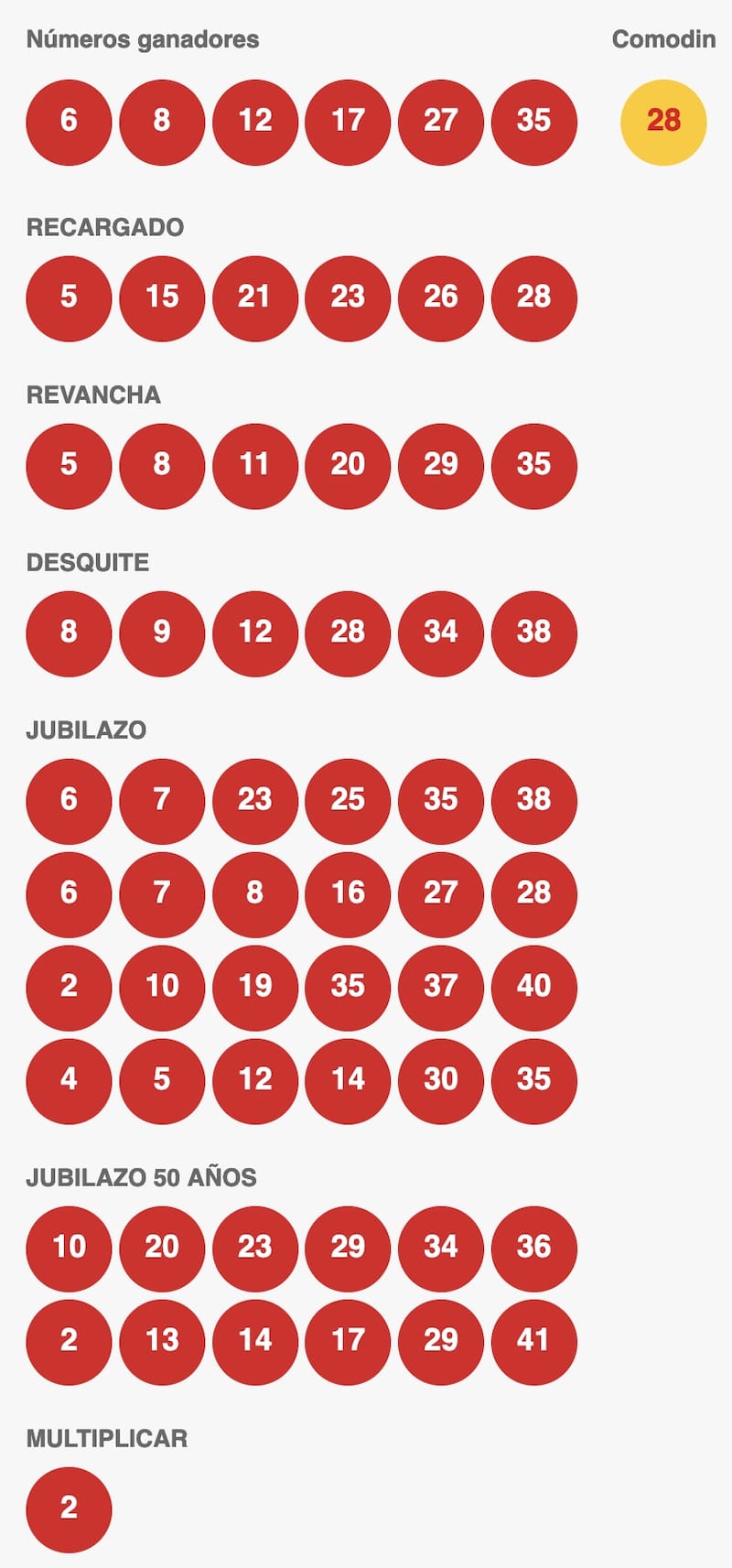 - Números ganadores: 6, 8, 12, 17, 27, 35.