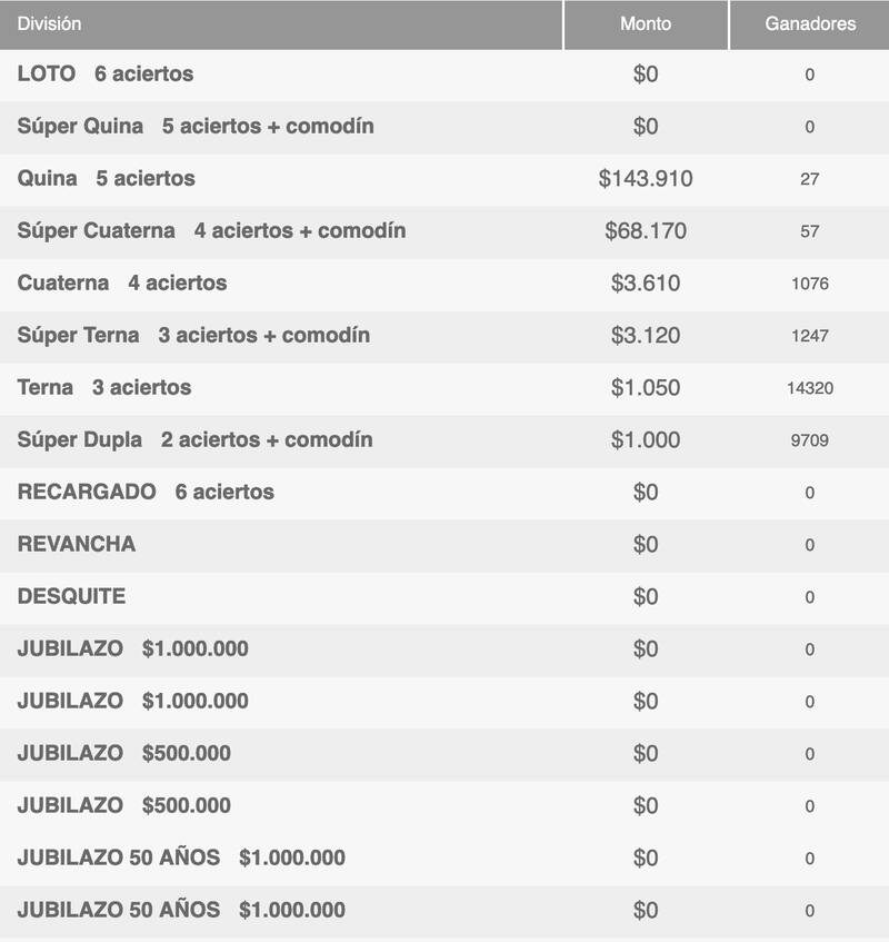 En esta oportunidad no se registraron ganadores en las siguientes categorías: Loto 6 aciertos, Súper Quina, Recargado, Revancha, Desquite y Jubilazo.