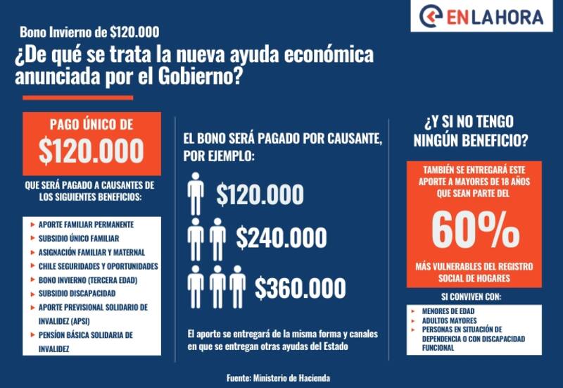 El Bono Invierno o Bono Chile Apoya de Invierno, como se bautizó a este nuevo proyecto, es un aporte que está destinado a cerca de cuatro millones de familias (un total de 7.5 millones de personas), que entregará un aporte monetario de $120 mil, para hacer frente a la situación económica del país.