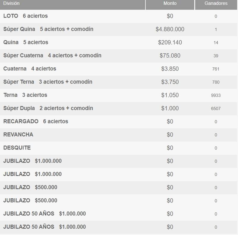 Sin embargo, en la Súper Quina + Comodín hubo un afortunado que se llevó $4.880.000. Además, miles de jugadores se llevaron algunos premios en las otras categorías, aunque de menores montos, entre los que destacan Quina y Súper Cuaterna.