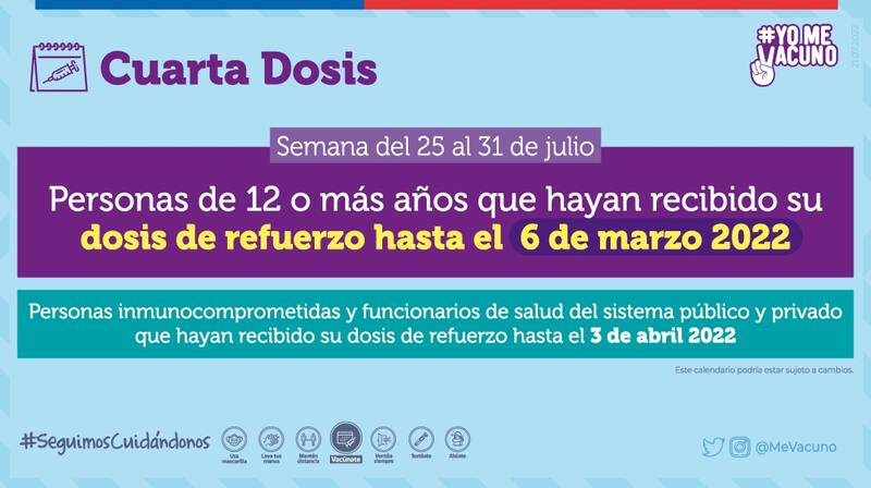 Para este domingo 31 de julio el ministerio de Salud (Minsal) continúa con el Calendario Vacunación contra el Covid-19, el cual para esta última semana de julio incluye nuevos grupos que esperan por la cuarta dosis de refuerzo, además de aquellos que quieran recibir su tercera, segunda o primera vacuna contra el coronavirus.