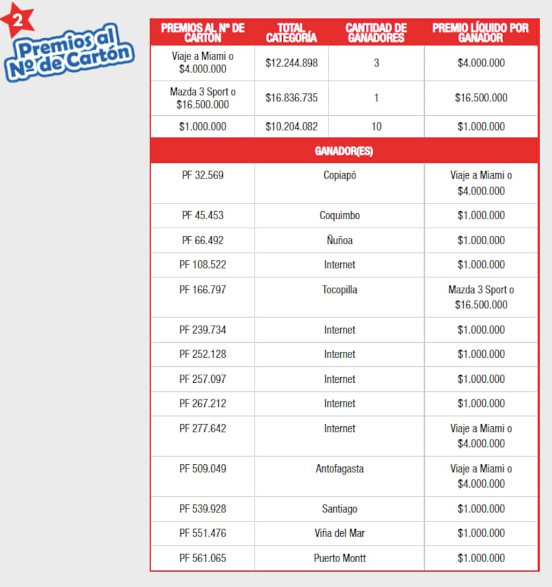 En tanto, en Premios al Número de Cartón, 10 jugadores/as se embolsaron premios de $1.000.000, 3 personas se quedaron con un viaje a Miami o su equivalente a $4.000.000, mientras que una o un afortunado se llevó un auto Mazda 3 Sport o su igual a $16.500.000.