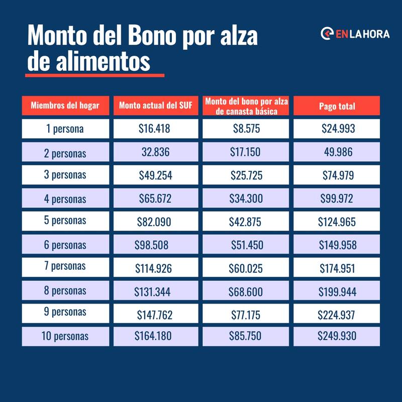 Bono Canasta Básica: entrega un monto de dinero cada mes por cada carga familiar y varía según el costo de la Canasta Básica de Alimentos. Este aporte se suma al dinero que entrega el SUF, como una forma de aumentar este ingreso.