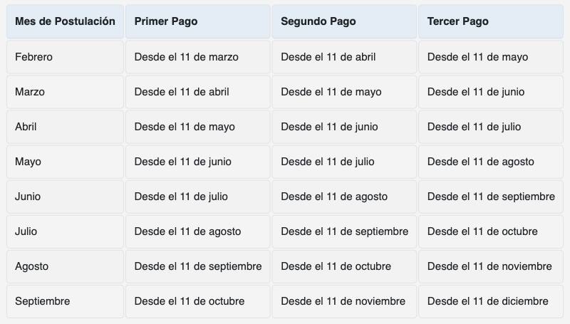 Este beneficio comienza a pagarse el mes siguiente a la postulación. Asimismo, su pago se realiza el día 11 de cada mes. Revisa a continuación el calendario de los siguientes pagos: