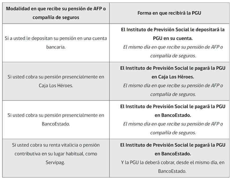 Sin embargo, para las personas que reciben este aporte de manera presencial en alguna entidad diferente a las mencionadas (Servipag, Banco Santander, Banco Falabella u otros), el IPS pagará la PGU en Banco Estado el mismo día en que se entrega la pensión normal de AFP o compañía de seguros.