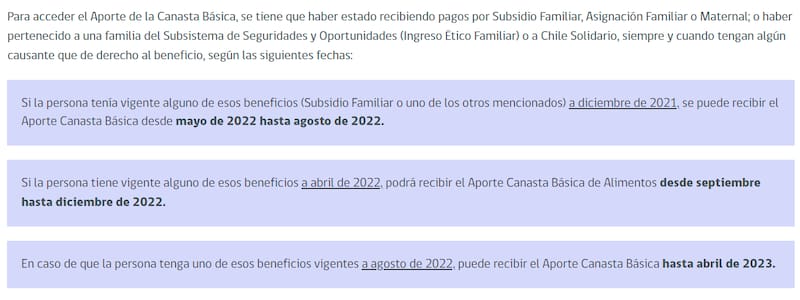 Esta modificación comenzará a aplicar desde septiembre de 2022. Actualmente, desde mayo a agosto de 2022 se puede ser beneficiario/a del Bono Canasta Básica si la persona tenía vigente alguno de esos beneficios (Subsidio Familiar, Asignación Familiar, Asignación Maternal, Chile Seguridades y Oportunidades o Chile Solidario) a diciembre de 2021.