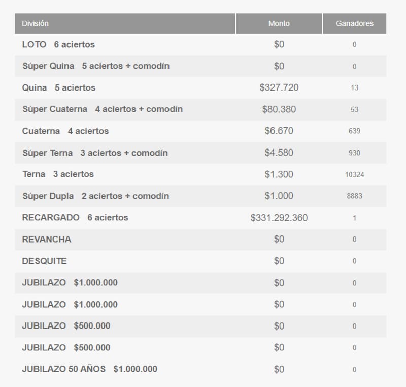 Una persona ganó un premio de $331.292.360 en Recargado. En tanto, en Quina 5 aciertos, 13 jugadores o jugadoras se embolsaron $327.720 cada uno/a, mientras que en Súper Cuaterna un total de 53 personas ganaron $80.380.