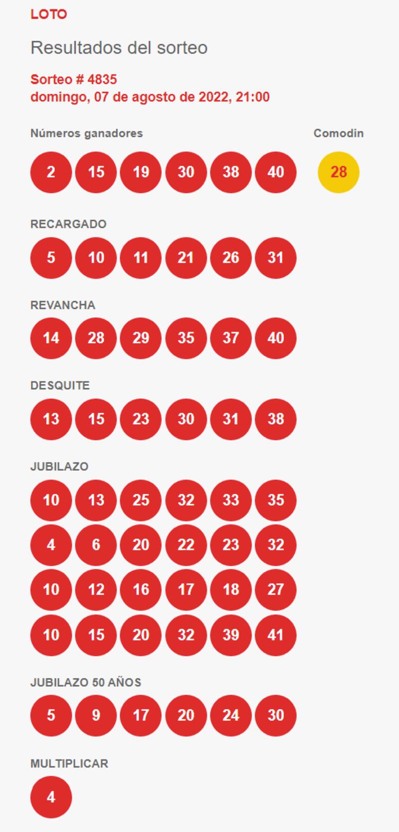 Cabe destacar que los sorteos de Loto se realizan a las 21:00 horas de cada martes, jueves y domingo, por lo que el próximo será el martes 9 de agosto.