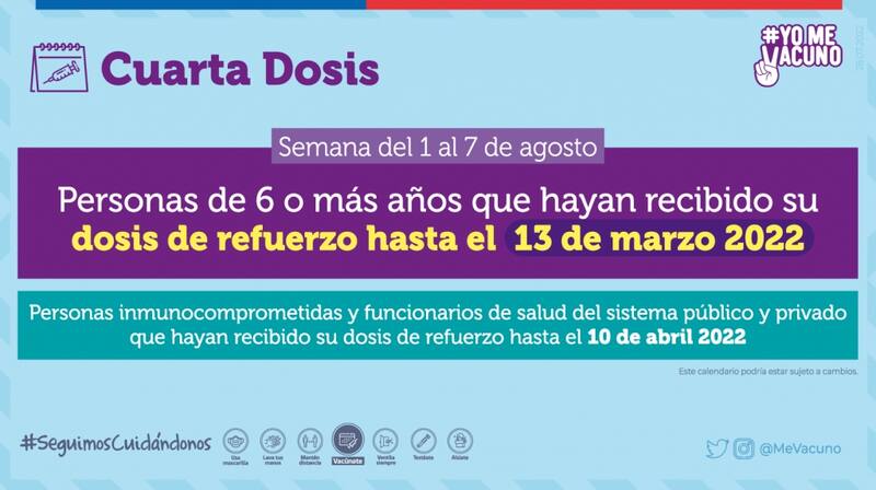 Comenzó agosto y el Minsal continúa con el calendario de vacunación contra el Covid-19, proceso para el cual durante este fin de semana, incluye nuevos grupos que recibirán su cuarta dosis.