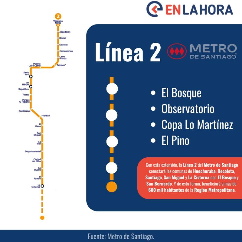 Según informó Metro de Santiago, las nuevas estaciones que se sumarán a la línea 2 del Metro que se extenderán desde el metro La Cisterna serán: