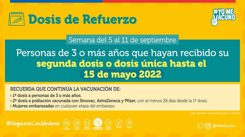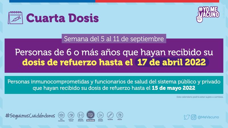 Este sábado, el Ministerio de Salud (Minsal) continúa con el Calendario de Vacunación Covid-19, donde se incluye a nuevos grupos que esperan por la cuarta dosis de refuerzo, además de aquellos rezagados que pueden recibir su primera, segunda o tercera inyección contra el coronavirus.