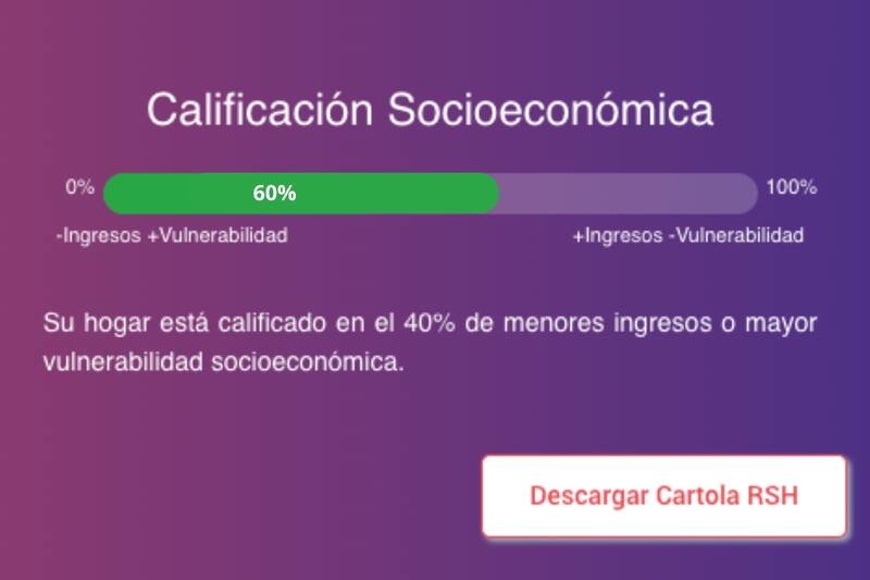 Considerando los factores anteriormente nombrados, el Registro Social de Hogares entrega una calificación en un porcentaje que llega hasta el 100%. Este porcentaje indicará en que posición de menores ingresos o mayor vulnerabilidad socioeconómica se ubican las familias.