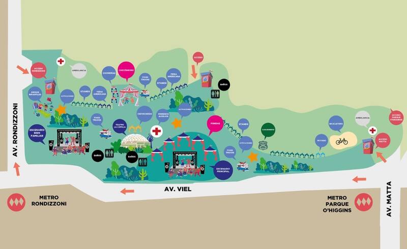 Los accesos a la Fonda Santiago son por Av. General Rondizzoni (Metro Rondizzoni Línea 2), Av. Matta (Metro Parque O’Higgins Línea 2) o por los estacionamientos pagados en Club Hípico.