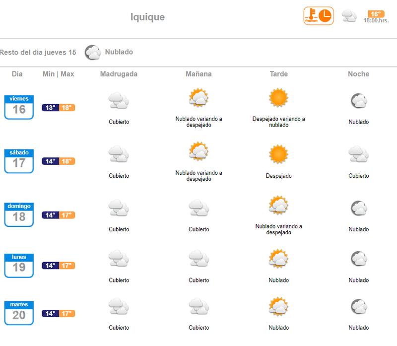 Iquique tendrá las madrugadas y mañanas cubiertas o nubladas, mientras que en algunas tardes variará a despejado. Respecto a las temperaturas, del viernes al lunes los días iniciarán con 13 o 14 grados, llegando a un tope de 17 y 18°C en las tardes.