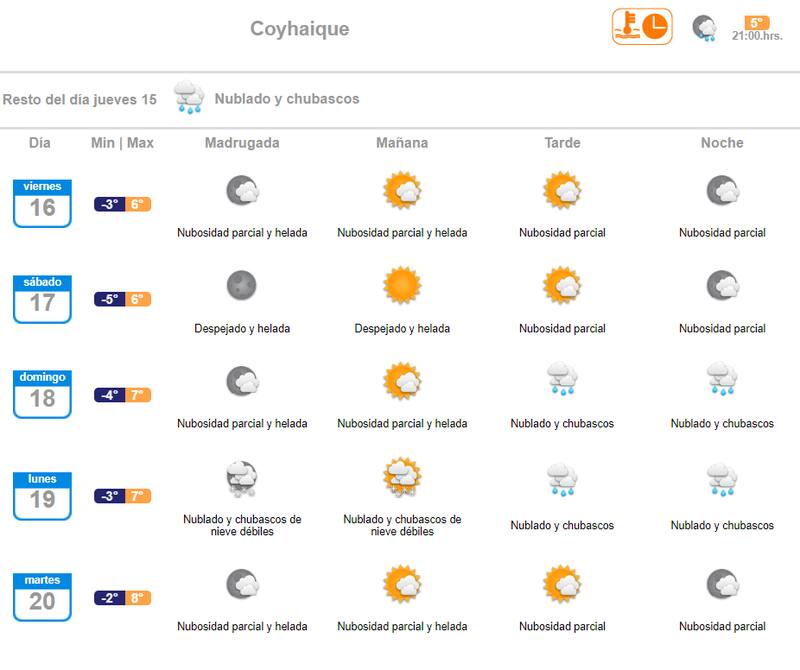 En Futaleufú caerá aguanieve este viernes, lloverá en la tarde y noche del domingo y caerá nieve el lunes. Solo el sábado habrá nubosidad parcial. La mínima estará en los 0 y -1 grados desde el 16 al 19 de septiembre. Lo mismo sucederá en Cochamó, pero en esta comuna nevará el sábado y en la tarde del domingo; el lunes solo lloverá.