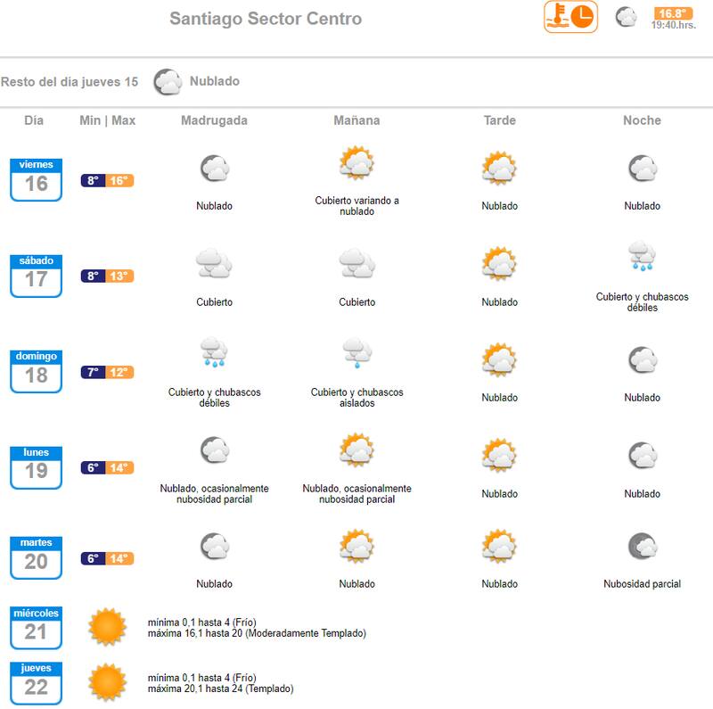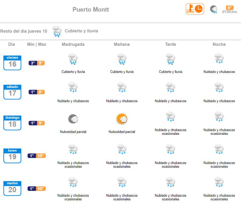 Puerto Montt tendrá lluvias todo el viernes y sábado. Luego, continuarán desde la tarde del domingo hasta la noche del lunes. En Osorno ocurrirá algo similar, pero la mañana del sábado, domingo y lunes no tendrá lluvia, esto solo ocurrirá en la tarde y noche. Las temperaturas estarán entre -1 y 10 grados.