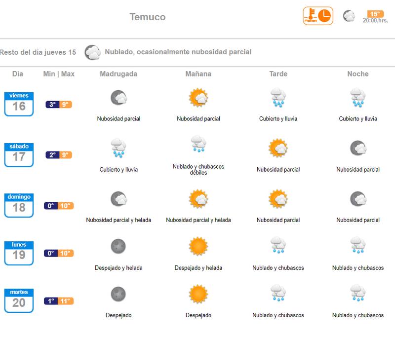 En Temuco y Angol lloverá desde la tarde del viernes hasta la tarde del sábado. Estos dos días las temperaturas marcarán entre 2 y 7 grados de mínima, y la máxima entre 9 y 13°C. Desde el domingo ya habrá nubosidad parcial y cielos soleados, pero con heladas en las mañanas, donde los termómetros registrarán 0 y -1 grados, y entre 10 y 11°C como máxima.