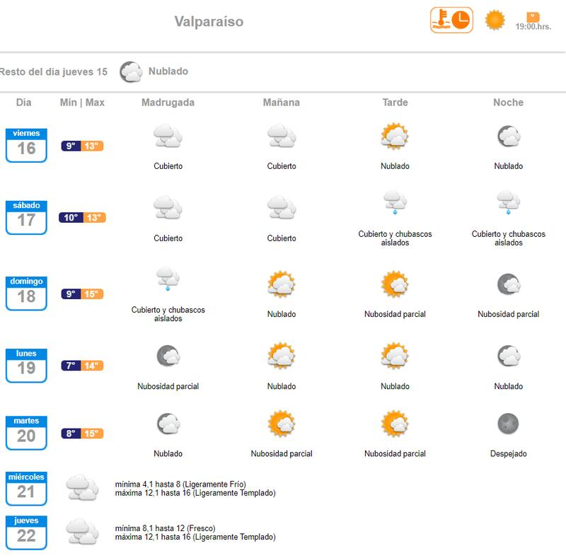 En La Ligua, Papudo, Zapallar, Viña del Mar, Valparaíso, San Felipe, Los Andes, La Calera, Quillota, Villa Alemana, Casablanca, Algarrobo, San Antonio y Cartagena, tendrán unas Fiestas Patrias con cielos nublados o cubiertos, y temperaturas entre los 6 y 9 grados como mínima, mientras que la máxima estará entre los 12 y 17°C.