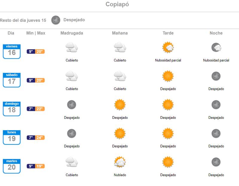 Este viernes en Copiapó estará cubierto en la madrugada y mañana, mientras que luego habrá nubosidad parcial. Desde la tarde del sábado estará el cielo despejado. La mínima marcará entre 7 y 9 grados, y la máxima entre 20 y 24°C.