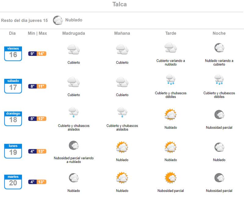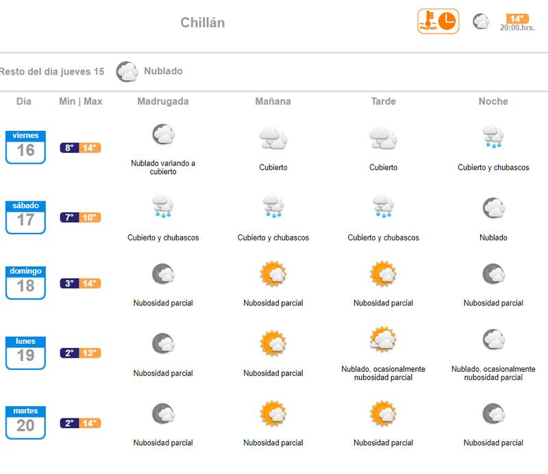 En la Región del Ñuble la lluvia comenzará la tarde y noche de este viernes, con precipitaciones hasta la tarde del sábado 17 de septiembre. Ambos días estarán con cielos cubiertos, y temperaturas entre 7 y 11°C de mínima, con un peak de entre 10 y 14 grados.