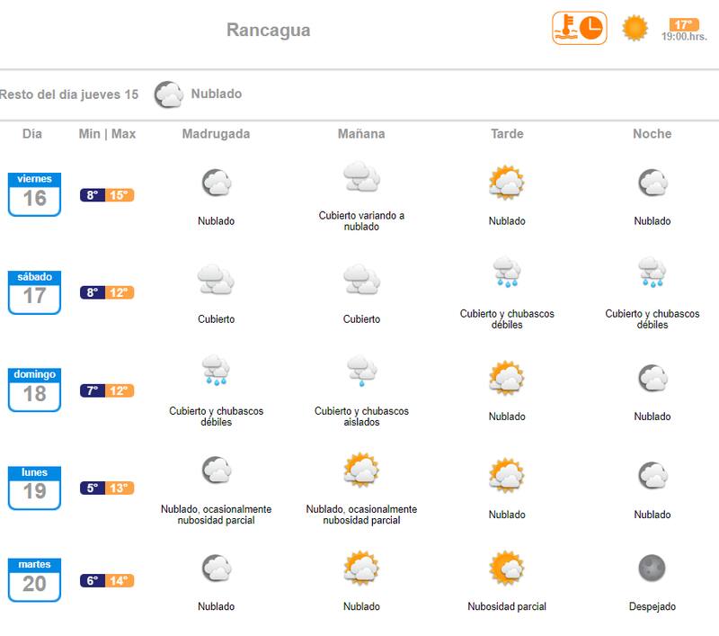 En Rancagua, Rengo, San Fernando, Santa Cruz y Pichilemu, los termómetros solo marcarán en las mañanas entre 5 y 8 grados, alcanzando durante el día entre 12 y 15°C.
