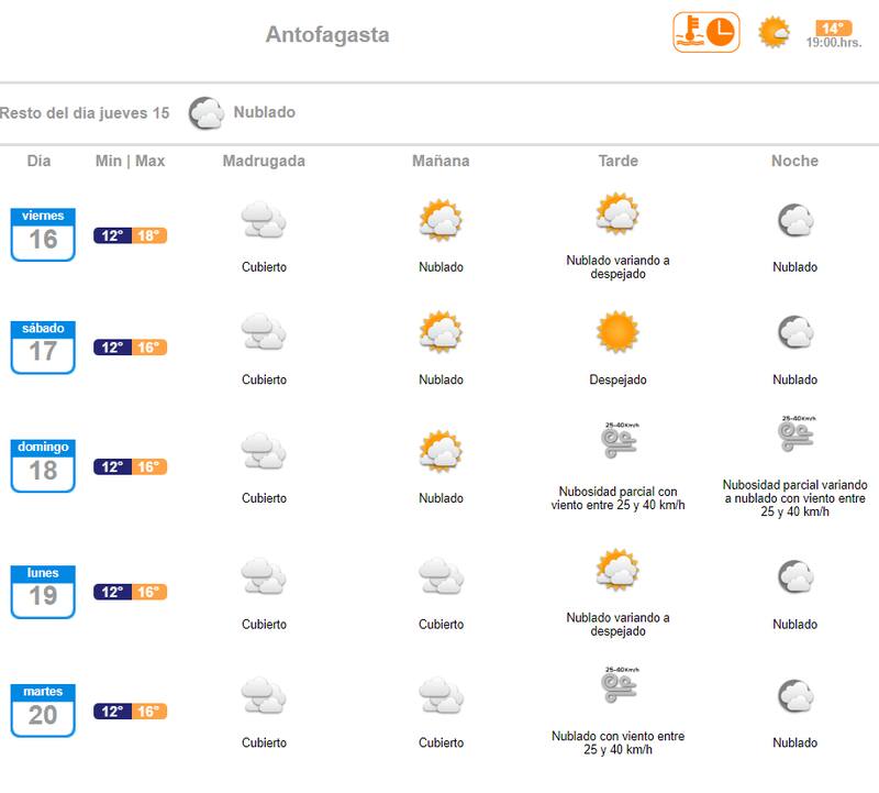 En Tocopilla, Mejillones, Antofagasta y Taltal, se esperan temperaturas un poco similares: la mínima estará entre 10 y 13 grados y la máxima entre 16 y 20°C, con cielos nublados o variando a despejados.