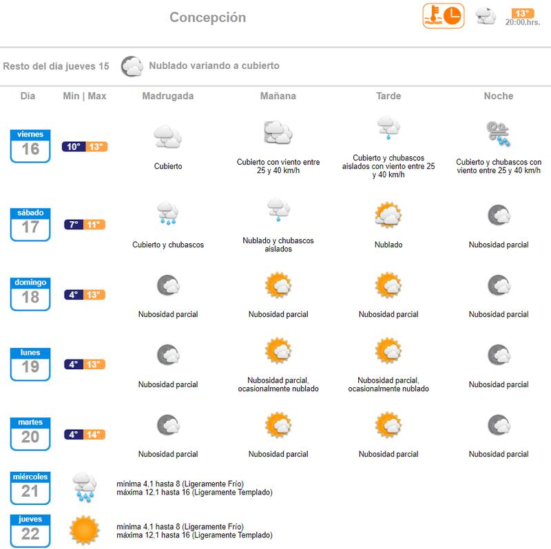 La lluvia comenzará en el Biobío la tarde de este viernes, con precipitaciones hasta la mañana del sábado. Estos dos días la mañana iniciará con temperaturas entre 7 y 10 grados, alcanzando luego entre 11 y 13 como tope.