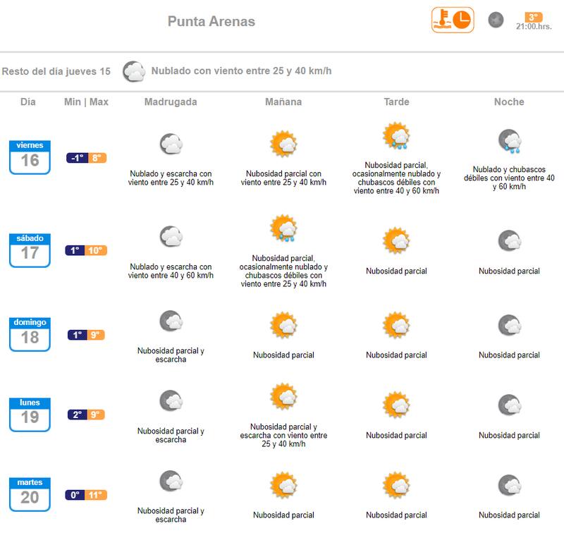 En Punta Arenas y Porvenir se espera lluvia la tarde y noche del viernes, así como la mañana del sábado. El resto de los días habrá nubosidad parcial, con temperaturas entre los -1 y 1 grados de mínima, y 8 y 10 de máxima.