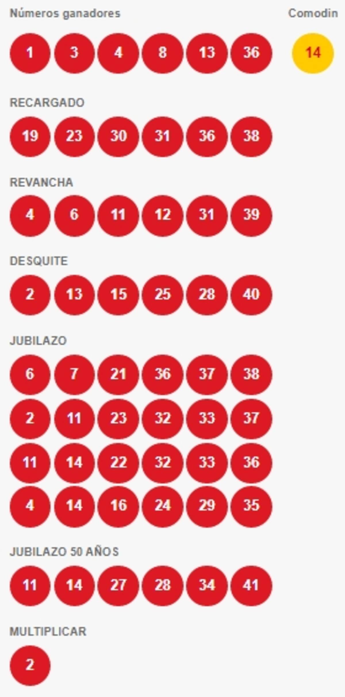 Números ganadores Loto: 1, 3, 4, 8, 13, 36.