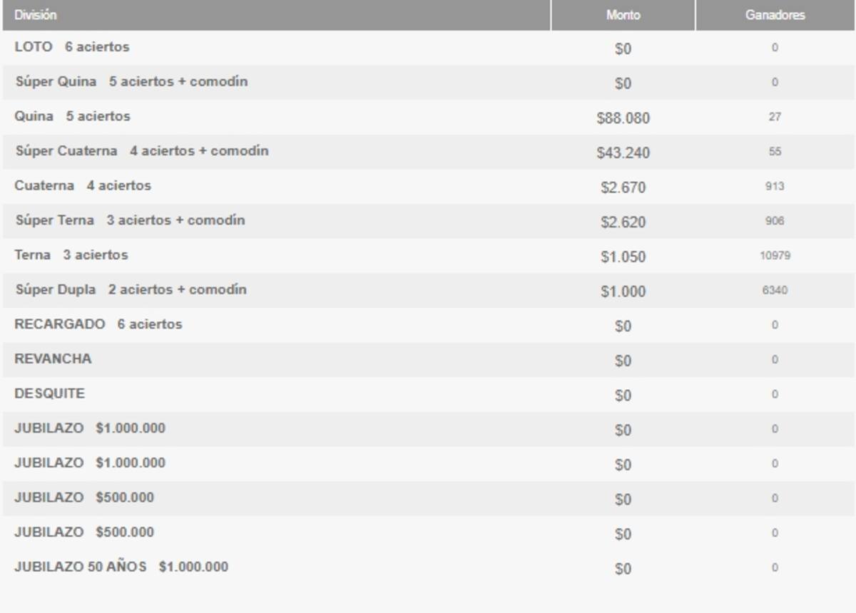 En este sorteo no se registraron afortunados en las siguientes categorías: Loto 6 aciertos, Super Quina, Recargado, Revancha, Desquite, Jubilazo $1 millón, Jubilazo $500.000 y Jubilazo 50 años.