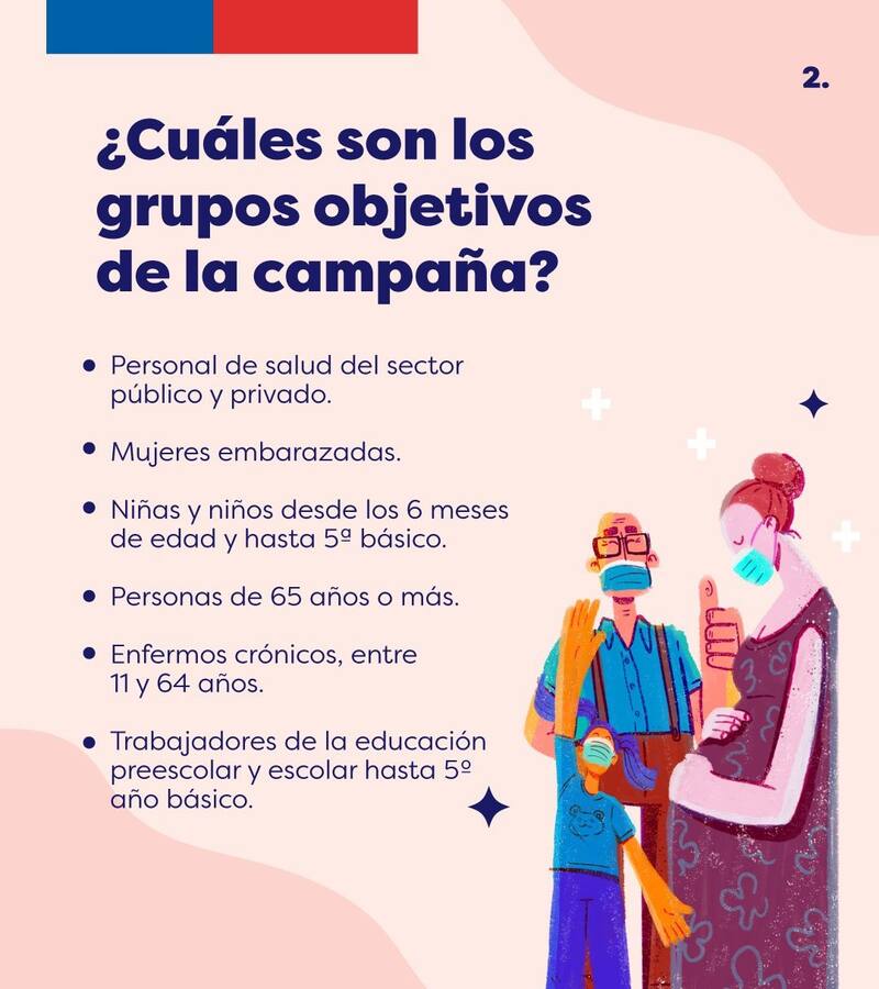 Para el propósito de preservar la integridad de los servicios asistenciales, la población objetivo de la Campaña Nacional de Vacunación contra la Influenza 2022 está compuesta por los siguientes grupos de personas:
