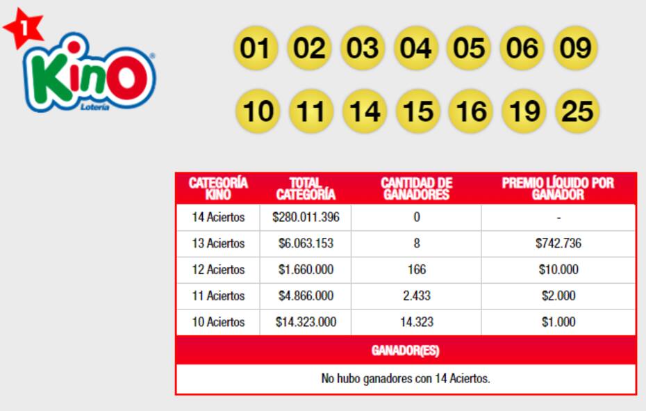 Sin embargo, sí hubo 8 personas afortunadas en Kino 13 aciertos, quienes recibirán $742.736 cada una. También hubo 166 ganadores en la subcategoría de 12 aciertos, por lo que se embolsarán $10.000. En las de 11 y 10 aciertos, más de 16 mil personas recibirán $2.000 y $1.000, respectivamente.