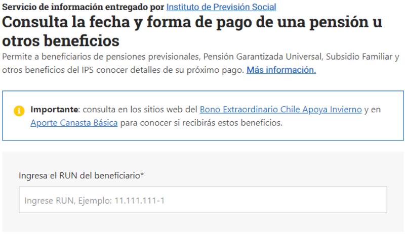Allí, solo bastará con escribir tu RUT, ante lo cual se te informará tanto del día de cobro, como el monto a recibir y el método de pago.