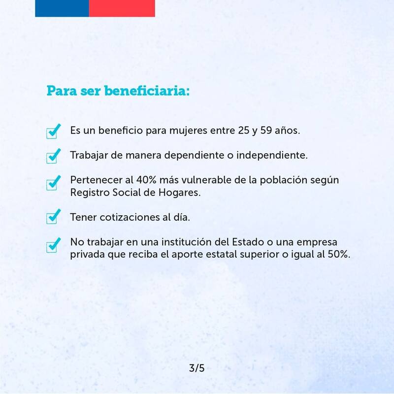 Este aporte estatal está dirigido a mujeres entre 25 y 59 años que se encuentren dentro del 40% de la población más vulnerable, de acuerdo al Registro Social de Hogares (RSH).