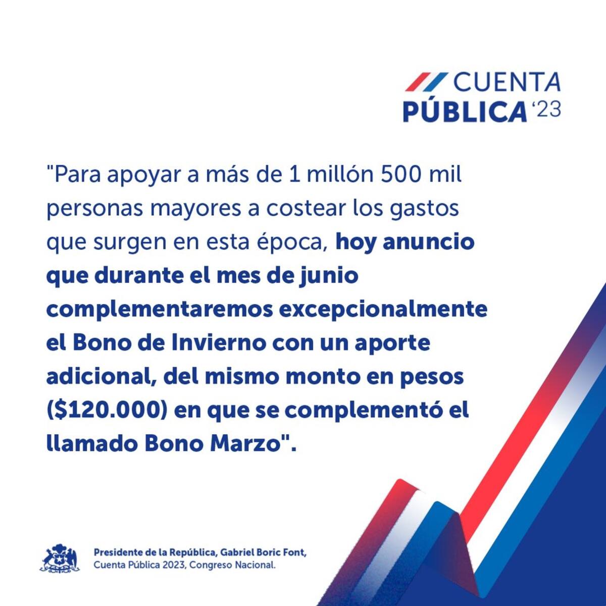 Sin embargo, el día jueves en el marco de la realización de la segunda Cuenta Pública, el Gobierno anunció una serie de garantías estatales, entre ellas la entrega de un monto complementario para el Bono de Invierno de este año 2023.