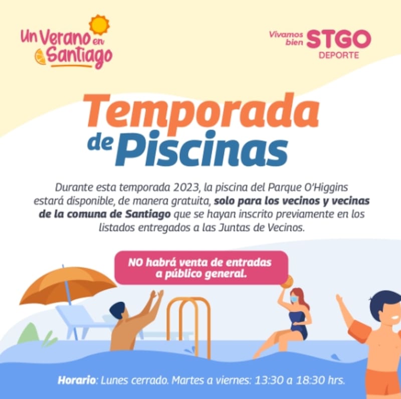 Tal como indica la Municipalidad de Santiago, para este 2023, la Piscina del Parque O'Higgins estará disponible de manera gratuita solo para vecinas y vecinos de la comuna.