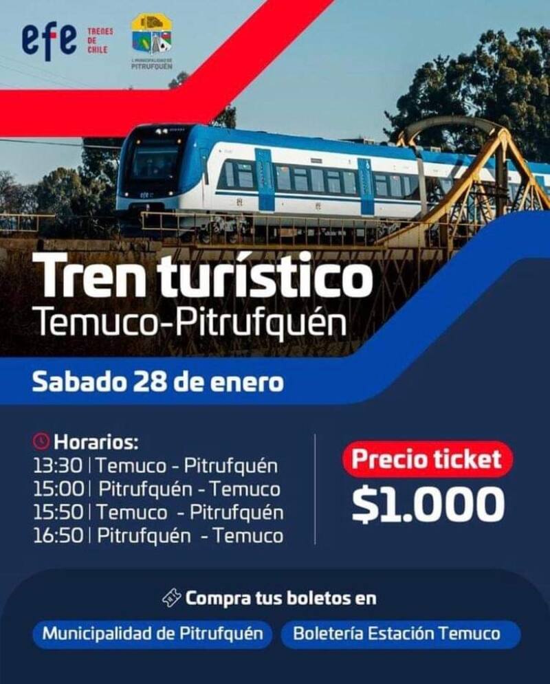 El tren turístico que recorrerá desde Temuco a Pitrufquén tendrá un valor de $1.000, pasajes que se podrán comprar a contar del próximo lunes 23 de enero en los siguientes lugares: